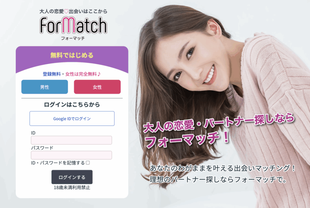 フォーマッチは、「ママ活を通して本当に相性の良い相手と出会いたい人」向けのコミュニティ型マッチングサービスです。
